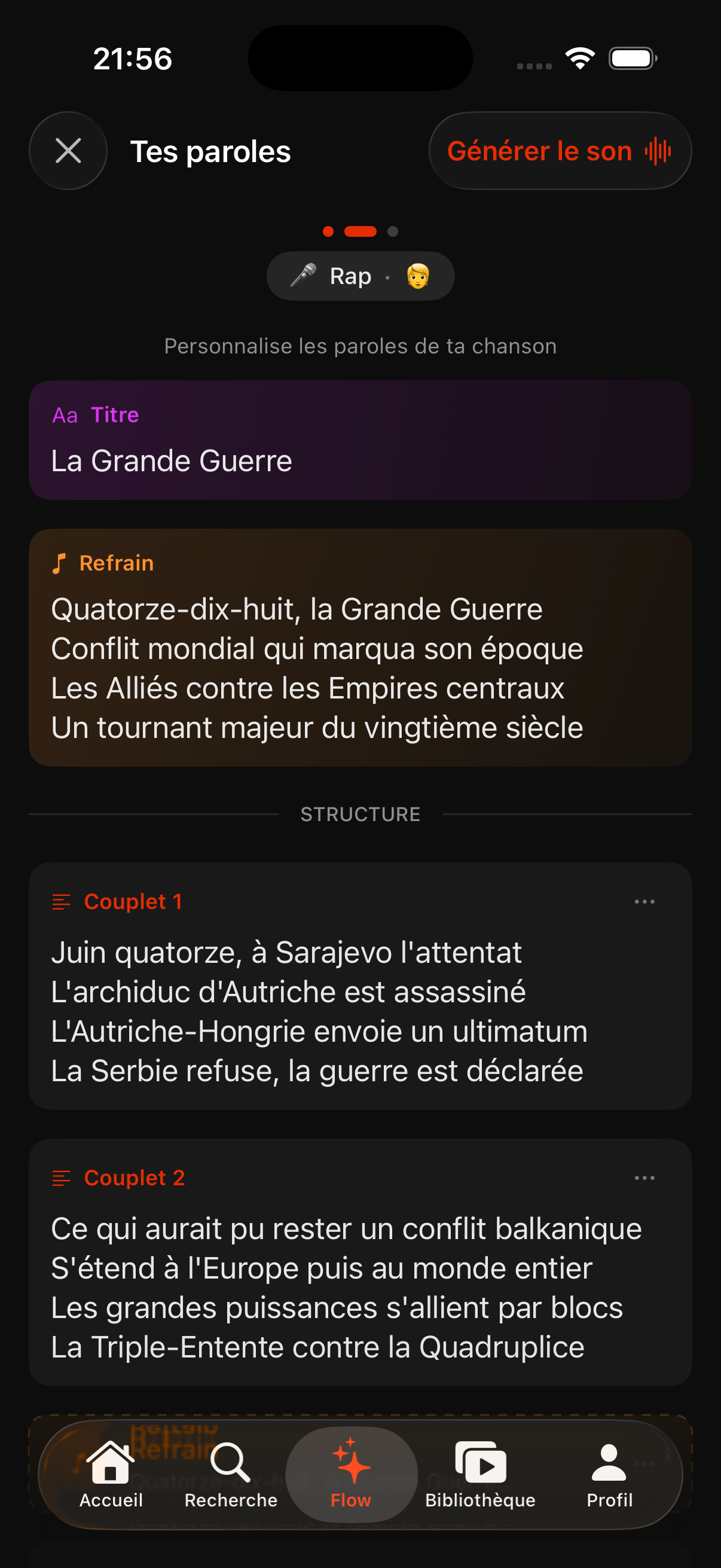 Dein Text wird in Songtexte verwandelt. Refrain, Strophen — alles ist dabei.